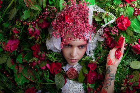 Female portrait in fairy tale stylization surrounded with natural flowers.