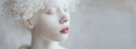 portrait of a young albino girl with blond curly hair on a light background, space for text