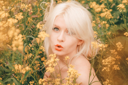 beautiful young blonde woman on the meadow with yellow flowers on a warm summer day