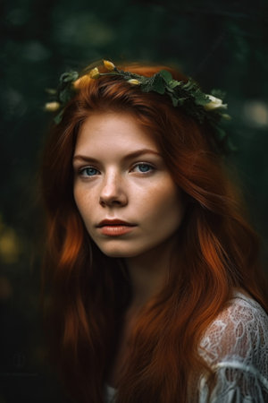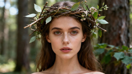 Capturing a serene moment, this portrait features a woman adorned with a leafy crown, highlighting her natural beauty and gentle elegance. Soft lighting enhances her captivating gaze.