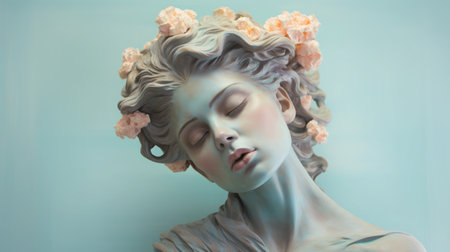 Marble head of a Greek goddess statue on a minimalist background. Pastel tones of baby blue, yellow, mint and soft pink create a serene and ethereal atmosphere