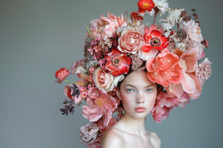 A striking portrait of a woman wearing a colorful floral headdress, captured with a bold and artistic aesthetic.