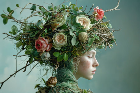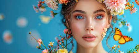 Woman with Flowers and Bird in Hair against Blue Sky Background
