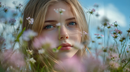 A blonde woman with striking blue eyes and long hair stands gracefully amidst a vibrant field of colorful flowers, embodying beauty and nature.