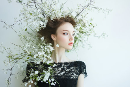 Elegant woman in black dress with artistic floral accent in fantasy inspired modern fashion portrait