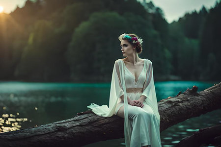 Mystical fairy swimming in enchanted forest pool