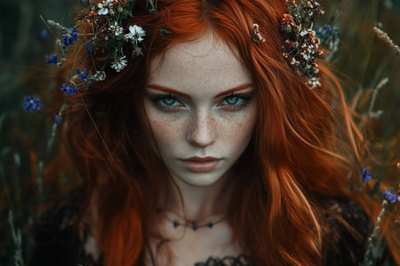 Amidst a serene meadow at twilight, a captivating witch with vibrant red hair and wildflowers woven into her locks gazes into the distance, embodying an aura of magic and nature's beauty.