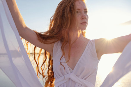 Beautiful young lady with long healthy red hair and cute white dress walking near lake. Hot summer evening. Sunset. Lifestyle concept.