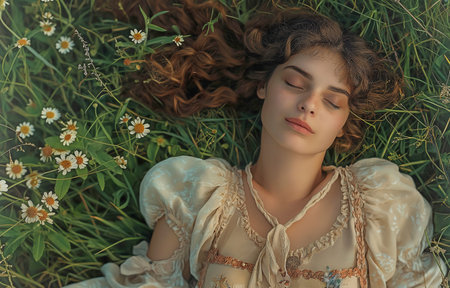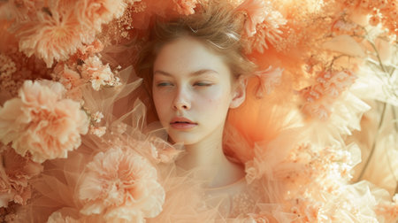 A woman with her eyes closed surrounded by flowers, AI