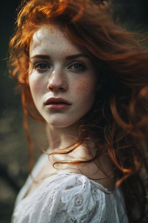 Close-up portrait of beautiful red-haired girl with freckles