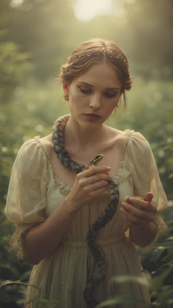Young beautiful woman in a vintage dress with a snake in her hand