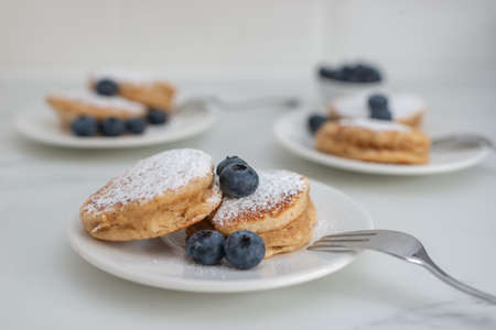 Handmade tiny pancakes with blueberry on white table. View from above. Trendy breakfast.