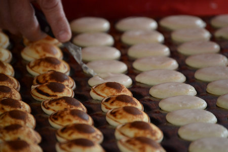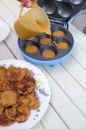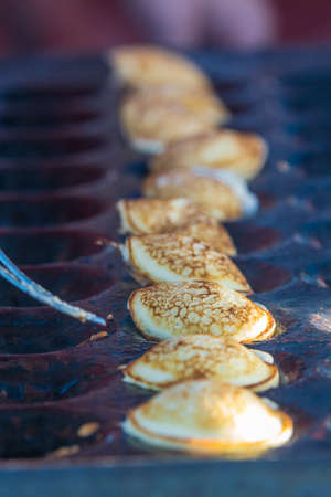 Typical Dutch poffertjes - tiny pancakes-being baked on a heavy cast iron pan being prepared during street food festival, an outdoor event, traditional dessert served with chocolate sauce and sugar