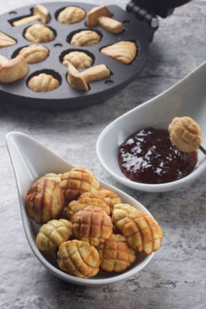 Khanom Kai, traditional Thai baked sweet dessert mini castella cake, made of starch, flour, egg, sugar. Thai Food, Bakery, Snack, Street Food, Chinese Egg Cake, Cuisine, Sponge Cake, Gourmet concept
