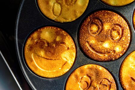 pancake frying pan with smile face pancake cooking on cooker in kitchen.