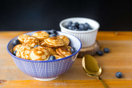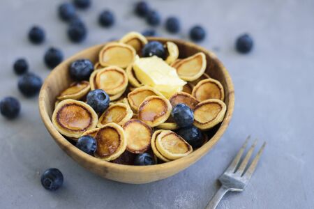 Trendy comfort food - small pancakes cereal in wooden bowl. Served with blueberries, butter and honey