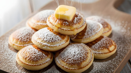 A mouth-watering stack of fluffy mini pancakes, or poffertjes, topped with a square of melting butter and dusted with powdered sugar. Steam rises from the hot breakfast treat, served on a wooden board.