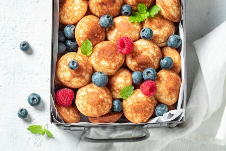 Pancakes or puffertjes with berries and maple syrup on rustic table.