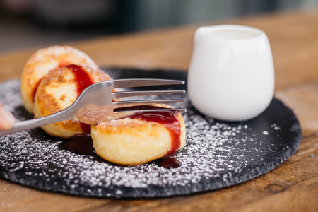 Top view of homemade cottage cheese pancakes- syrniki in a plate, jam on a wooden backdrop. Close up.