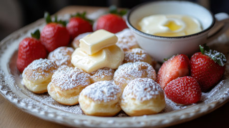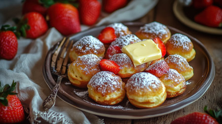 Cream puff filled with fresh strawberries and powdered sugar on a plate. Poffertjes