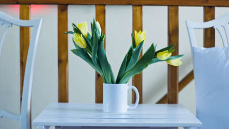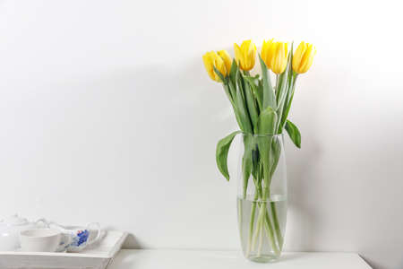 Bouquet of yellow tulip in the glass vase on white table