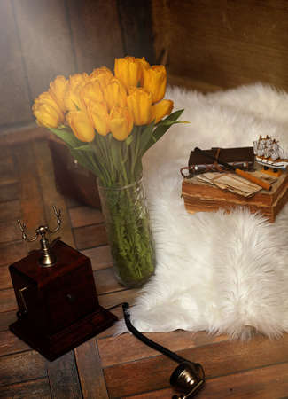 A bouquet of yellow tulips in vase in the interior of a retro room. Retro interior with bouquet of tulips old phone and suitcase.
