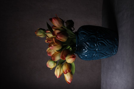 a bouquet of tulips in a blue vase. taken in close-up on a gray background with space for text. still-life