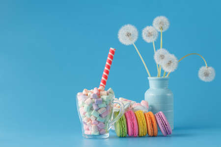 French delicious dessert macaroons and twisted marshmallow on table