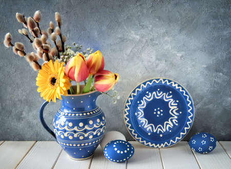 Spring flowers in blue ceramic pitcher with matching plate and Easter eggs on gray background