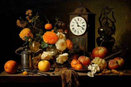 Flower Still Life Bouquet in Vintage Vase with a Clock, Ancient Dutch Masters Painting Oil Canvas Imitation, Abstract Generative AI Illustration