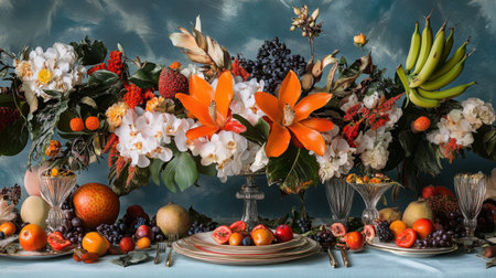 A stunning display of vibrant flowers and assorted fruits arranged beautifully on an elegant table, creating a lively centerpiece perfect for celebrations.