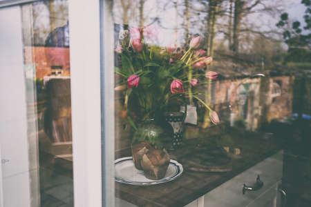 view through a windowpane on a vase with pink tulips and cupcakes