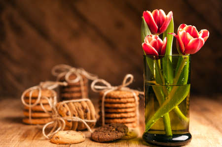 Simple rustic still life of red tulips in a green glass and stacks various cookies on wooden table.