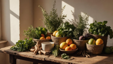 A beautiful arrangement of fresh produce including citrus fruits and various herbs in woven baskets on an old wooden table illuminated by soft window light.