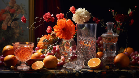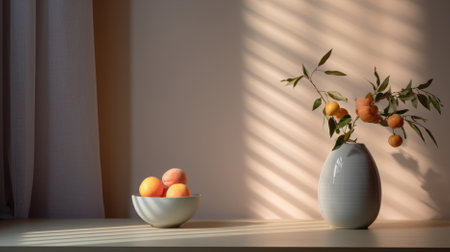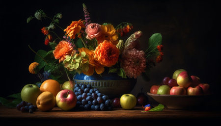 A simple provincial still life with fruits and flowers on a wooden table with natural light. AI generated.