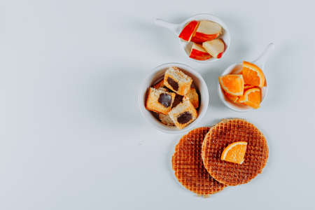 Waffles in a bowl with oranges, apples, cookies top view on a white background space for text