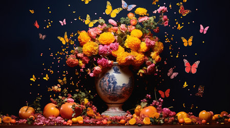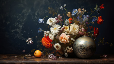 a vase with vibrant flowers sits on a table, reminiscent of lush baroque still lifes. the dark sky-blue and orange colors create a striking contrast. this photographic montage captures the essence of spherical sculptures and wimmelbilder, drawing inspiration from dutch and flemish art. the inclusion of kintsugi adds a touch of artistic elegance to the composition. ai generated