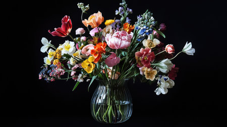 A stunning multicolored floral arrangement in a clear glass vase, showcasing a variety of vibrant flowers. Perfect for decoration or inspiration.