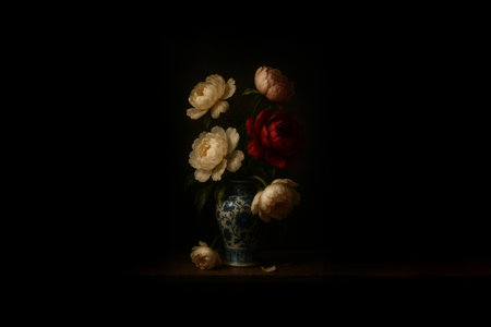 Still life with peonies in a vase on a dark background