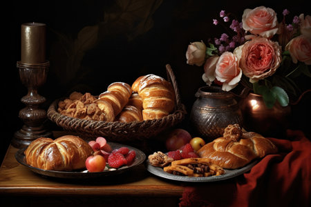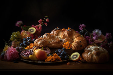 Still life with croissants, fruits and flowers on a dark background