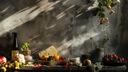 Sunlit still life arrangement with fruits, cheese, and wine bottles on a rustic table against a textured wall. Evokes classic culinary and cozy kitchen themes.