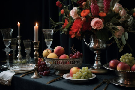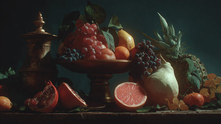 Luxurious still life of fruit in antique silverware with rich textures and lighting