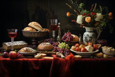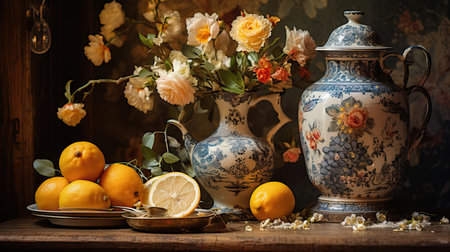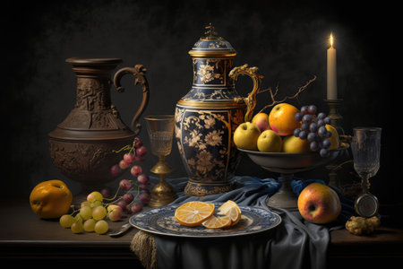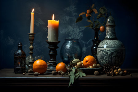 Classic still life composition, vase, fruit, candles. Generative AI