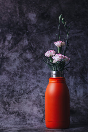 Red vase with pink carnation flowers on a dark background.