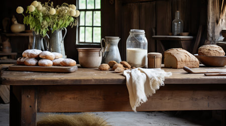 kitchen rustic wooden table illustration distressed character, sturdy cozy, nostalgic preserves kitchen rustic wooden table