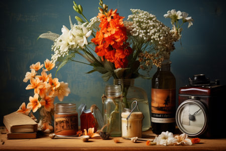 Nostalgic antique Vintage Still life with old Vintage objects and cinematic lighting, Vintage old memorable objects compositions, Ai generated