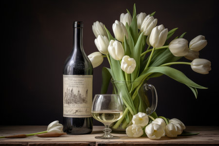 Elegant White Tulips in a Clear Glass Vase with Labeled Bottle - A Stunning 3:2 Snapshot
