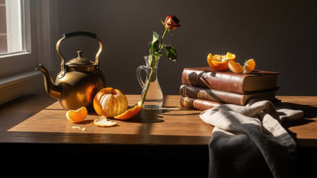 A still life arrangement showcases a teapot, books, and oranges alongside a delicate rose in a glass vase. The composition emphasizes natural light, creating shadows that define textures. This image provides a sense of warmth with its warm tones and could be used for lifestyle, culinary, or decorative purposes.