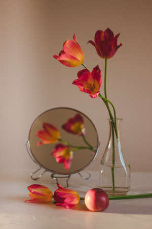 Artistic still life with bouquet of red tulips in a glass vase, mirror and apple