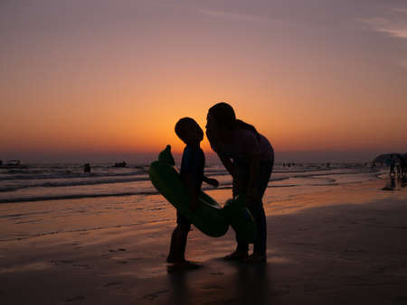 silhouette people family and pet meeting at beach and sea sand sunset background